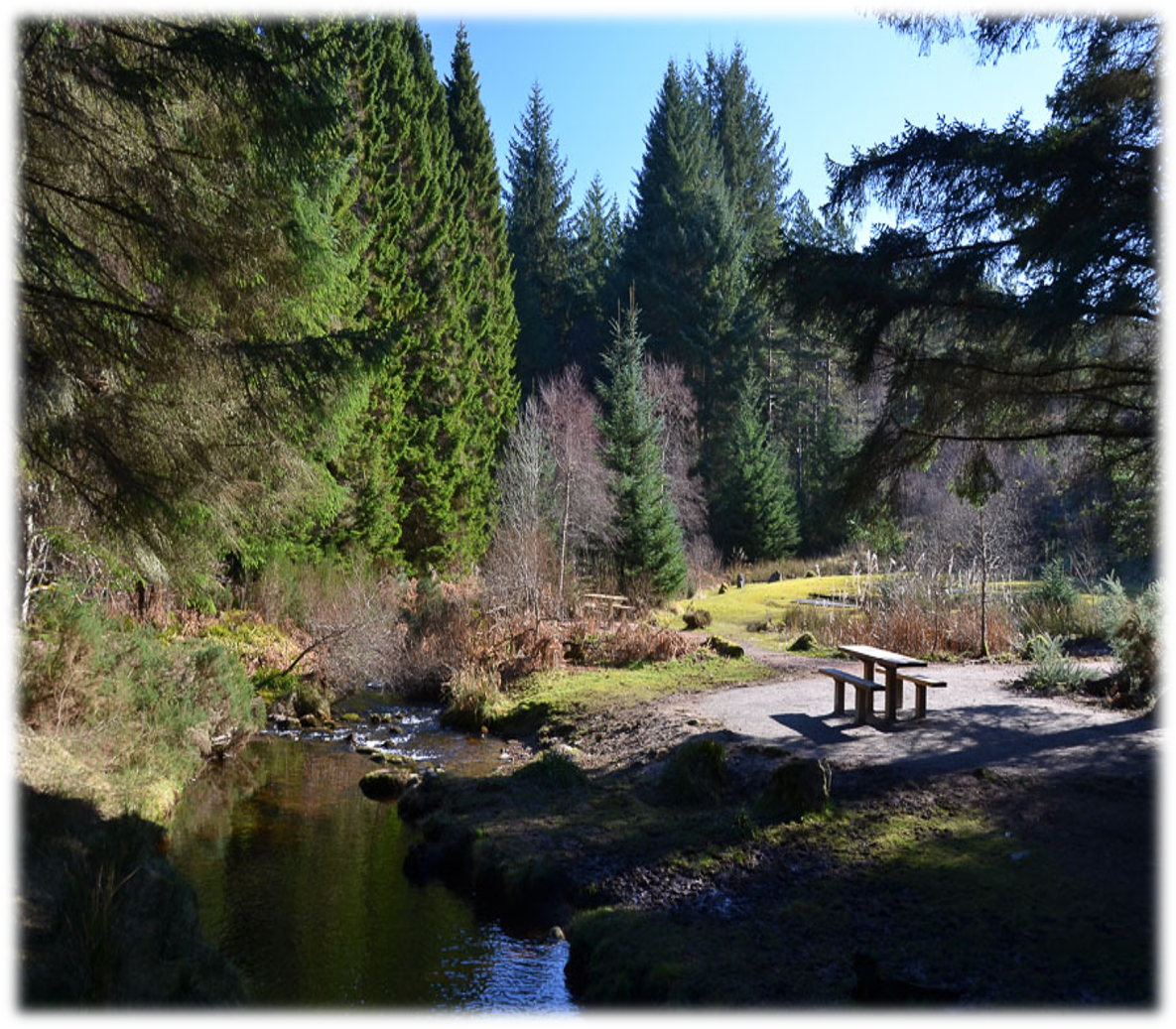 The Aldie Burn winds lazily through this interesting forest on its way to the sea. ... This is a forest for all ages, a place of tall conifers and tranquil pine, where capercaillie and pine marten hide in secret groves, and colourful dragonflies hover on gossamer wings. You will find peace here near Tain.